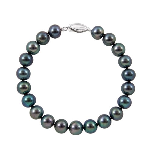 The brilliantly bold colors of this black freshwater pearl bracelet will brighten up even the dullest of days. The body of these dyed pearls varies from gray to black with intense overtones of blue, purple or green. The semi-round shape and good luster of the 'A' quality pearls make it a piece you'll treasure.This 8-inch bracelet is individually matched and knotted by hand on the finest 100% silk thread. It is finished with a .925 sterling silver clasp.